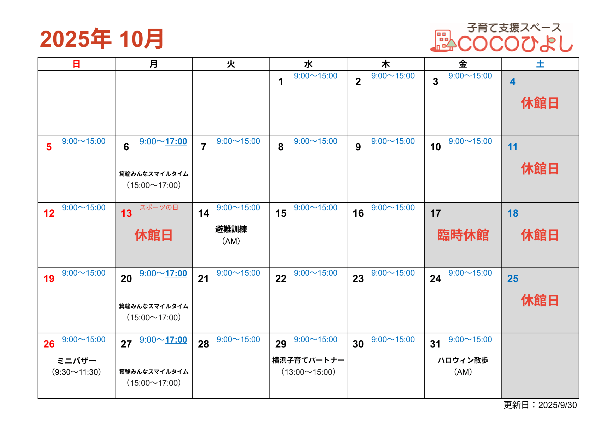 ★箕輪みんなスマイルタイム(15~17時開館)10/6(月)・9/20(月)・9/27(月)