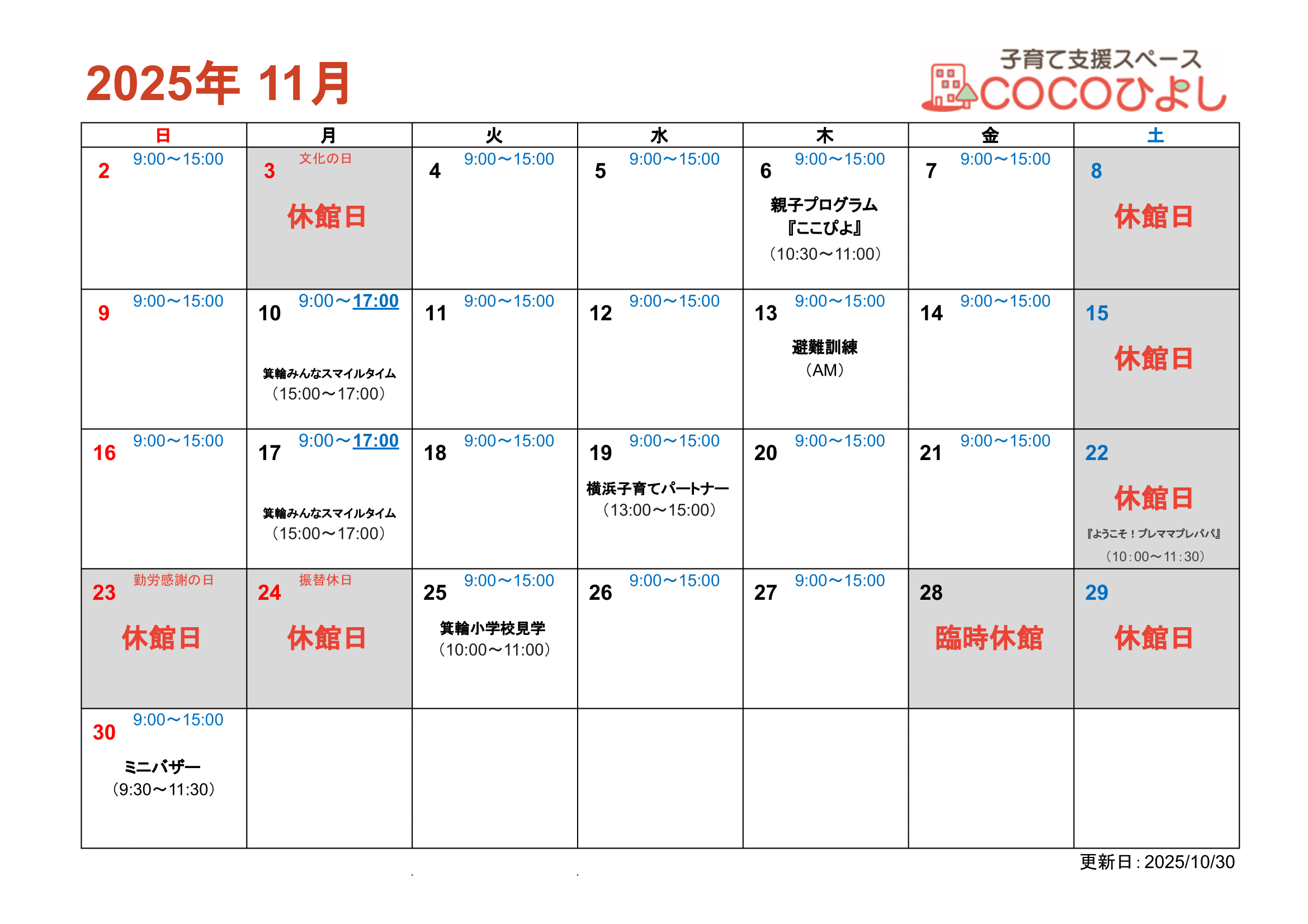 COCOひよし11月のカレンダーです。