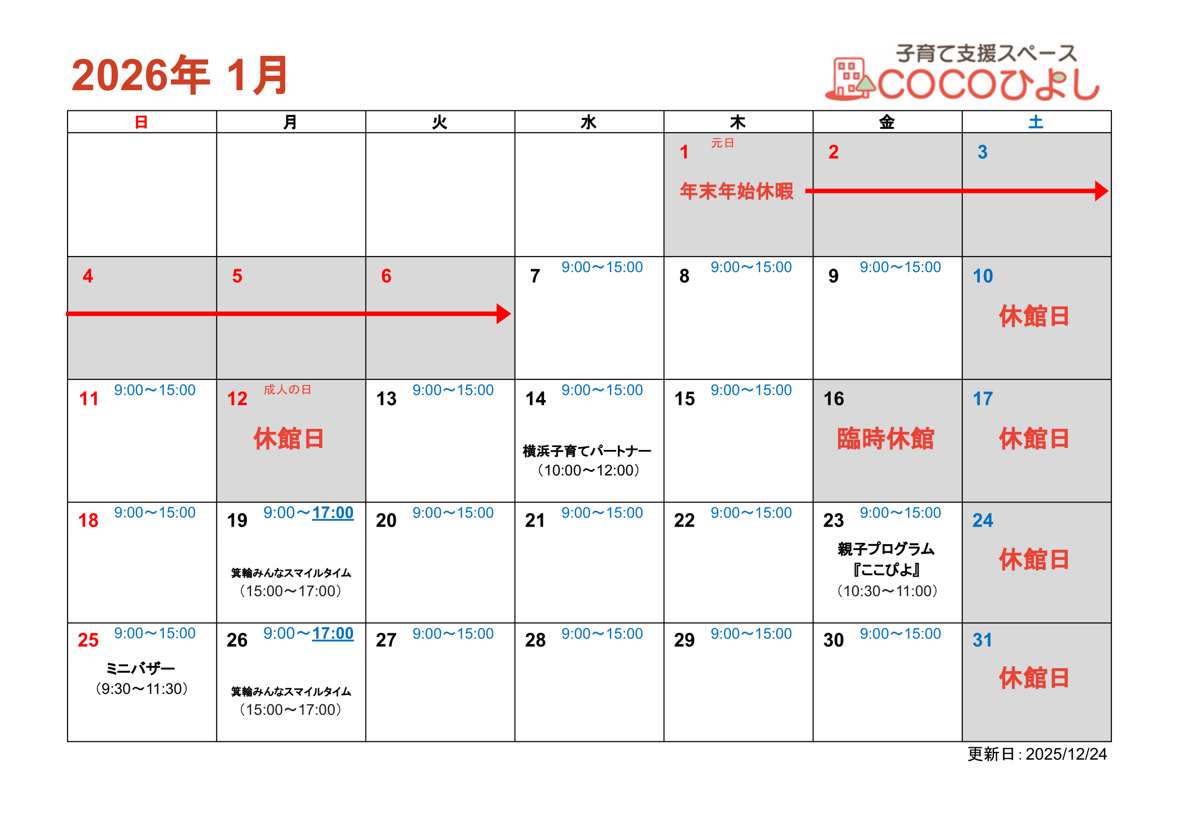 COCOひよし1月のカレンダーです。
