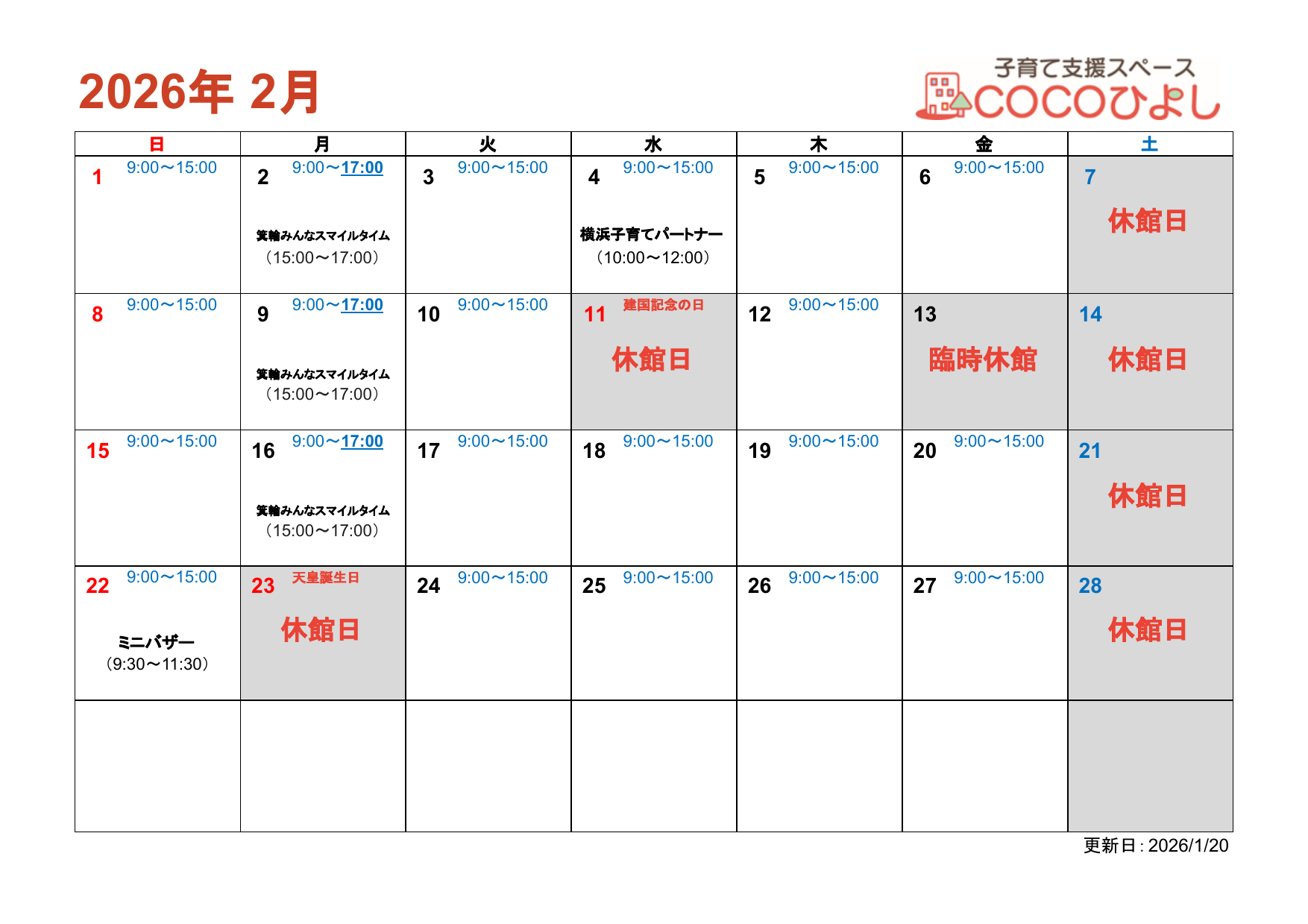 COCOひよし1月のカレンダーです。